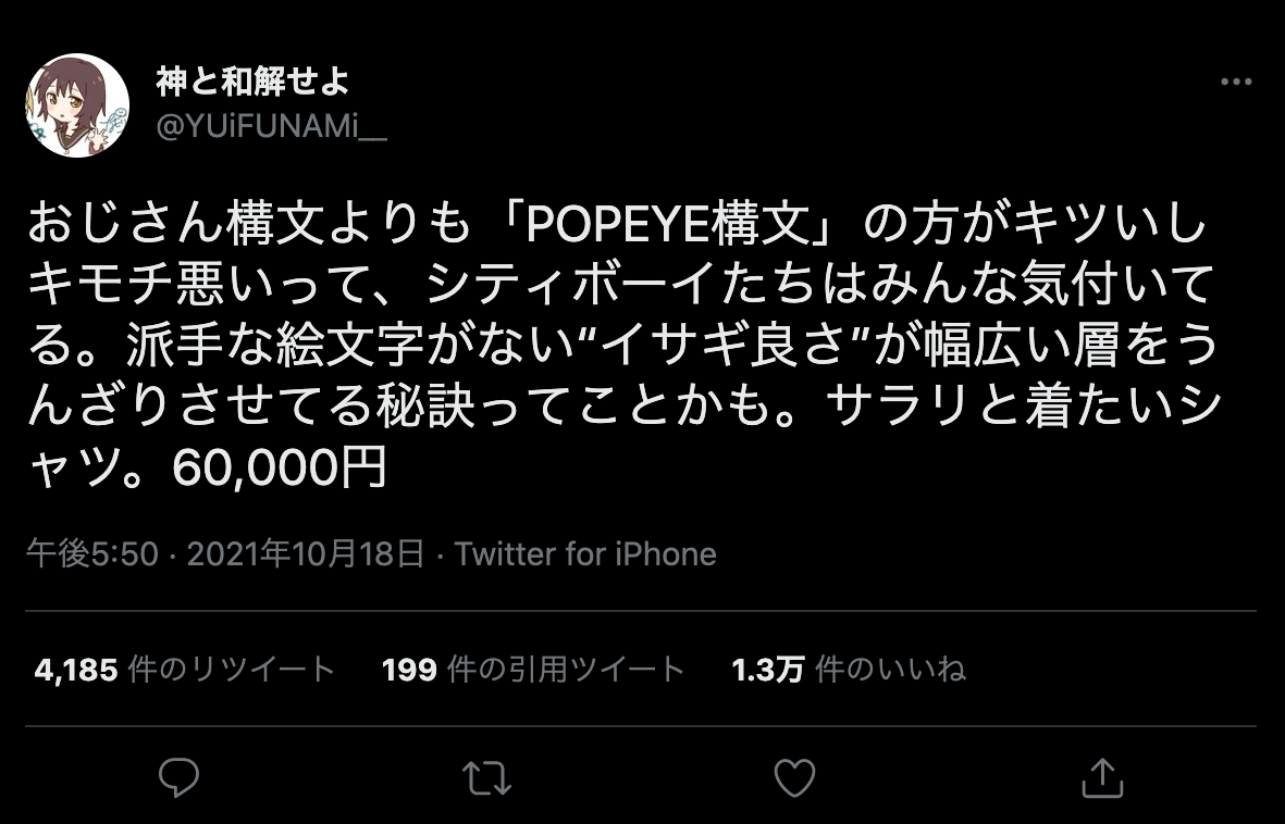 さらに最近になって、POPEYE構文というキーワードでバズっているツイートがあってこれがとにかく秀逸。